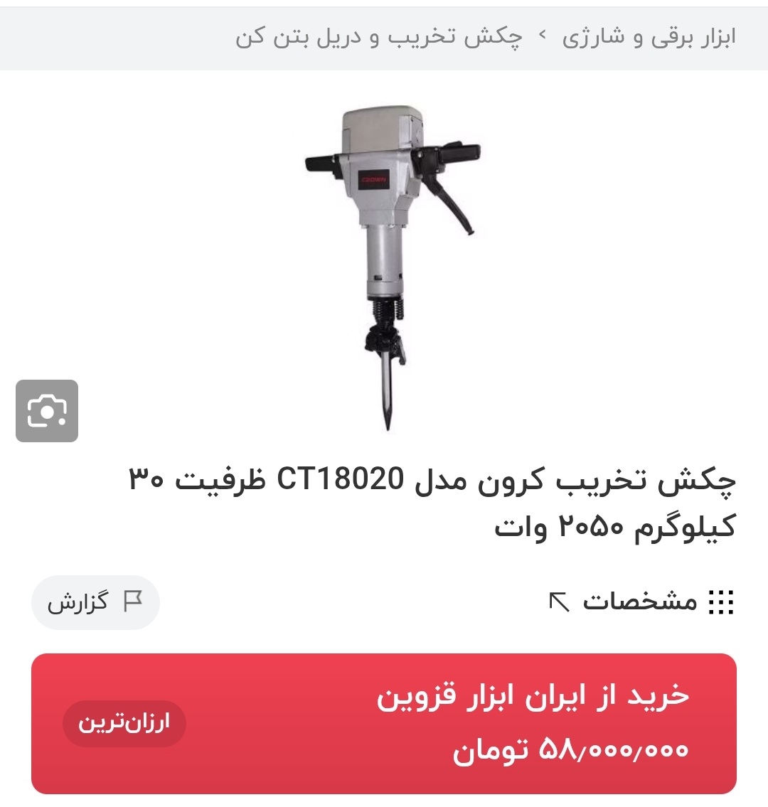 چکش تخریب مدل ct18020 ظرفیت 30 کیلوگرم 2050 وات